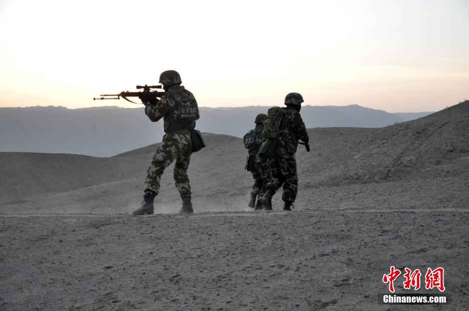 Kashgar border detachment of Xinjiang armed police frontier force conducts actual combat training for new recruits on Jan. 15, 2015. The training subjects include rescuing hostages, surprise attacks, breaking out encirclement and other field training. (Chinanews/Peng Xincheng) |