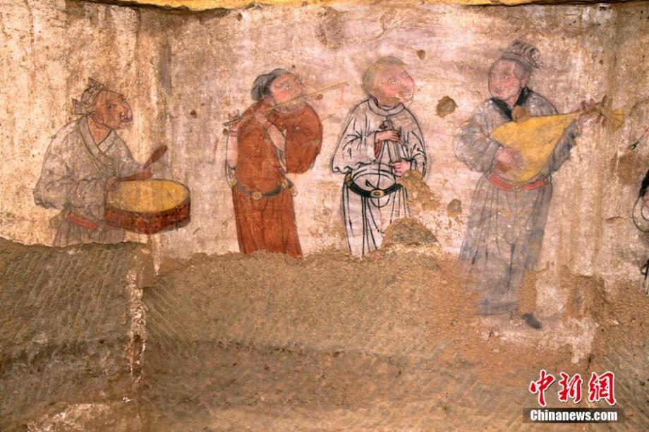 A tomb fresco dating back to Yuan Dynasty (AD1271—1368) was discovered in Hengshan county, northwest China's Shaanxi province on Jan. 18. The fresco shows a family feast of a husband and his five concubines. The exquisite fresco has provided valuable information for the study of Yuan Dynasty in Shaanxi province. (Photo provided to CNS)