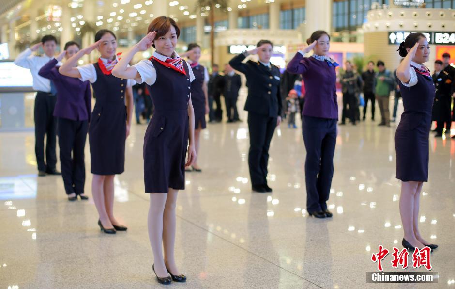 A flash mob, consisting of staff members in uniforms, welcomes passengers at Nanjing South Railway station , east China's Jiangsu province on Jan. 15, 2015. (CNS/Yang Bo)