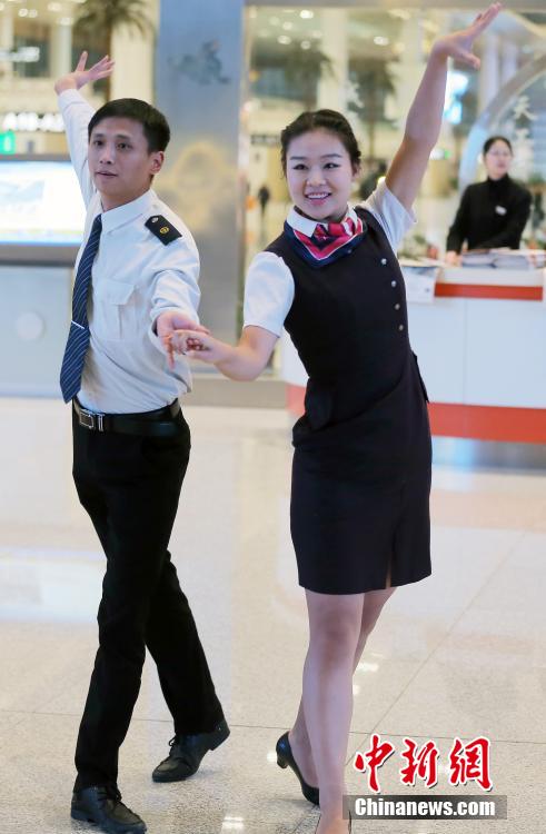A flash mob, consisting of staff members in uniforms, welcomes passengers at Nanjing South Railway station , east China's Jiangsu province on Jan. 15, 2015. (CNS/Yang Bo)