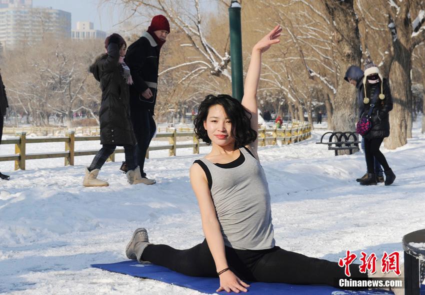 A pole dancer shows her moves in snow in Changchun, capital of northeast China's Jilin province, Jan. 19, 2015. The temperature that day was minus 20 degrees Celsius. It is said that the dancer wanted to show the charm of pole dancing through her moves, and to break people's prejudices against the dance. (CNS/Zhang Yao) |