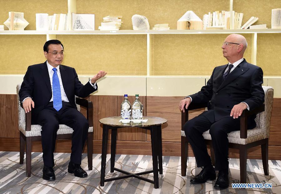 | Chinese Premier Li Keqiang (L) meets with Klaus Schwab, World Economic Forum founder and executive chairman, in Davos, Switzerland, on Jan. 20, 2015.(Xinhua/Li Tao) |