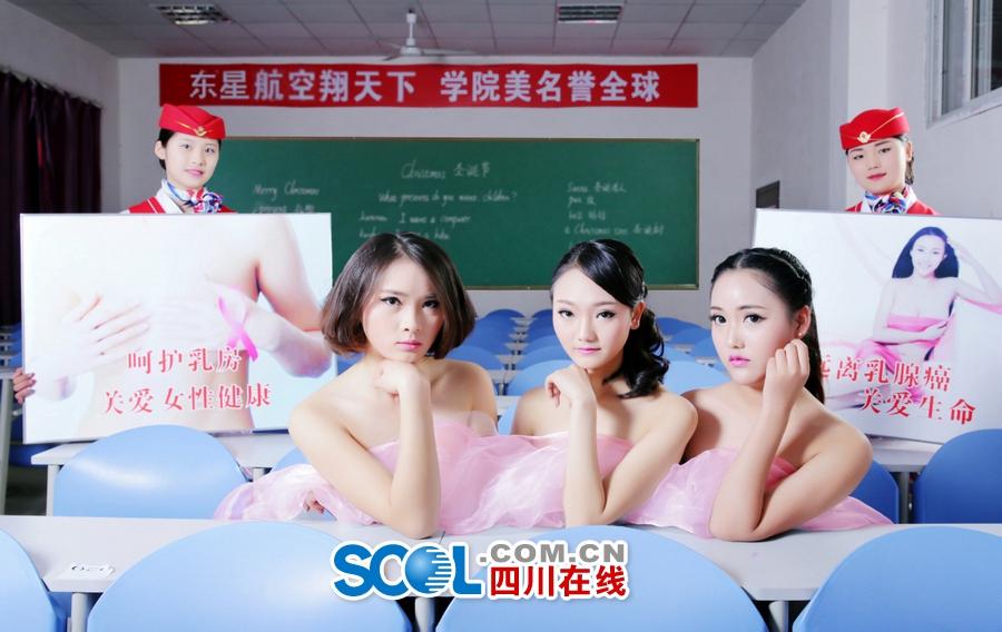 A group of girls in an aviation college hold a memorial ceremony for deceased Chinese singer Yao Beina in Chengdu, Jan. 19, 2015. Yao, who sang on the "Frozen" soundtrack "Let it go," died from breast cancer last Friday. After the memorial ceremony, the girls posed for nude photos to appeal for breast care to all women. "This is our first time taking nude photos, we hope more women would take good care of their body and health," said Ao Min, a student in the college. (Photo/scol.com.cn) |
