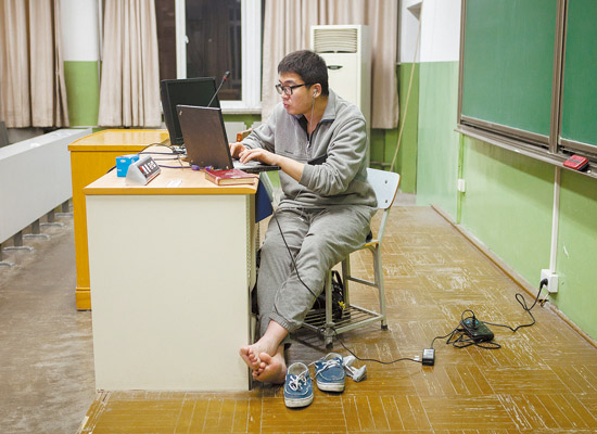 1:42 a.m., Nov.28, 2014 - Zhen Zhi, a postgraduate student, spends a sleepless night in the study room. (Photo/China Youth Daily)