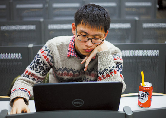12:55 a.m., Dec. 23, 2014 - Wang Ci, a junior majoring in accountancy, prepare for the final examination of the year. (Photo/China Youth Daily)