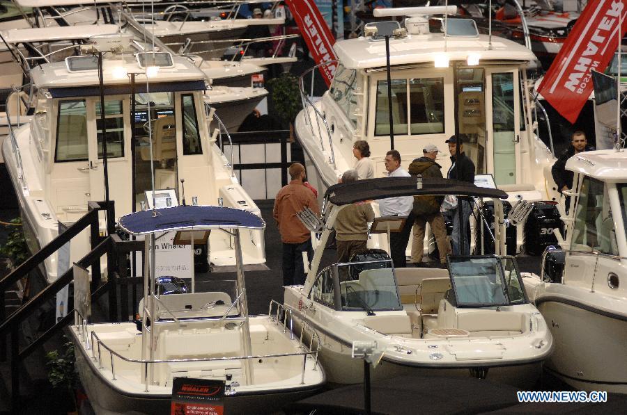 Visitors look at boats on display at the 2015 Vancouver International Boat Show at BC Place in Vancouver, Canada, Jan. 21, 2015. Canada's premier 5-day Vancouver International Boat Show featured the largest display of season's hottest boats, engines, electronics, marine gifts and accessories. (Xinhua/Sergei Bachlakov) |