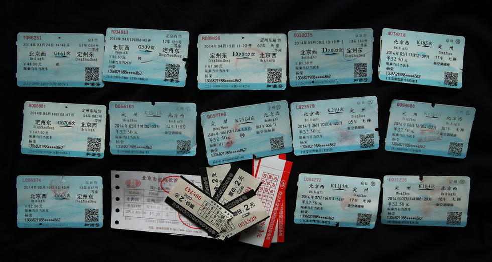 Some of the train tickets to Beijing Yang Rong bought. She went there to find information about MH307. (Beijing News/Ying Yafei)