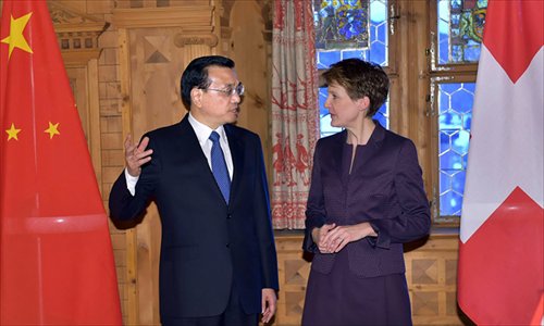 Chinese Premier Li Keqiang talks with President Simonetta Sommaruga of the Swiss Confederation on the sidelines of the 2015 annual meeting of the World Economic Forum in Davos on Wednesday. Photo: Xinhua |