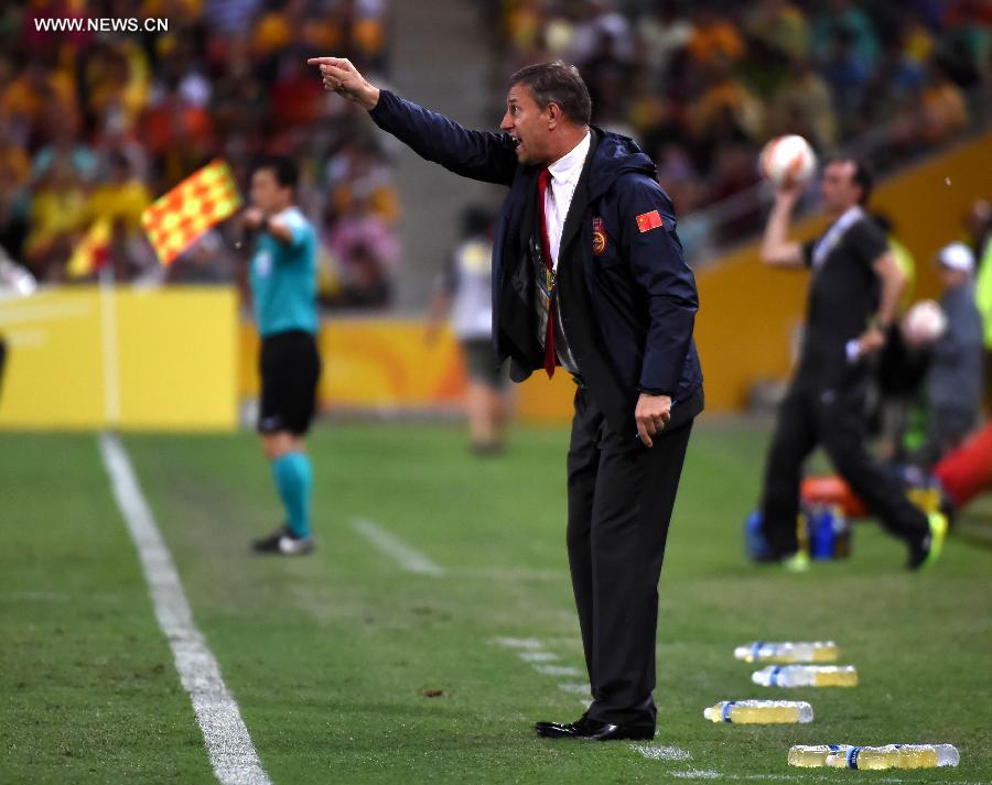 China's head coach Alain Perrin reacts during the quarterfinal match against Australia at the 2015 AFC Asian Cup in Brisbane, Australia, Jan. 22, 2015. China lost the match 0-2. (Xinhua/Guo Yong)