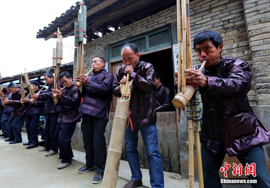 Dong people blow lusheng (a reed-pipe wind instrument) to celebrate their New Year. UNESCO has placed 18 Dong villages on the tentative World Heritage site list for China. (CNS/ Li Changhua)