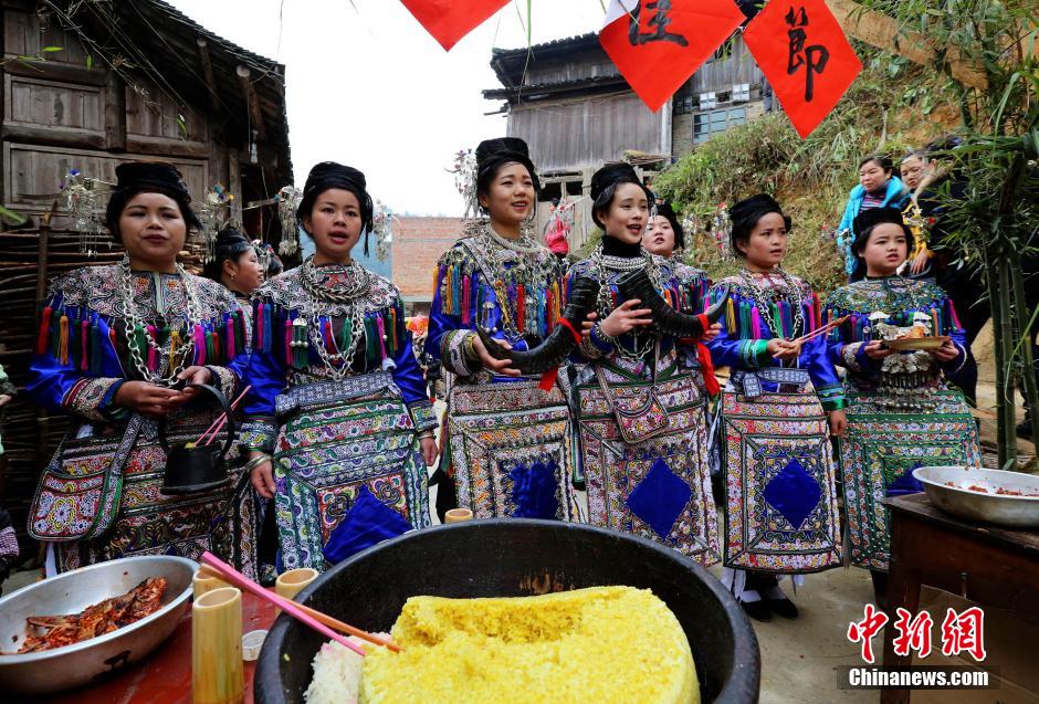 Dong ladies propose toasts to tourists on Jan. 20, 2015. UNESCO has placed 18 Dong villages on the tentative World Heritage site list for China. (CNS/ Li Changhua)