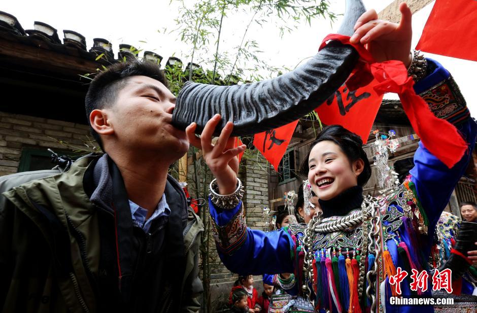 A Dong lady proposes toast to a tourist on Jan. 20, 2015. UNESCO has placed 18 Dong villages on the tentative World Heritage site list for China. (CNS/ Li Changhua)