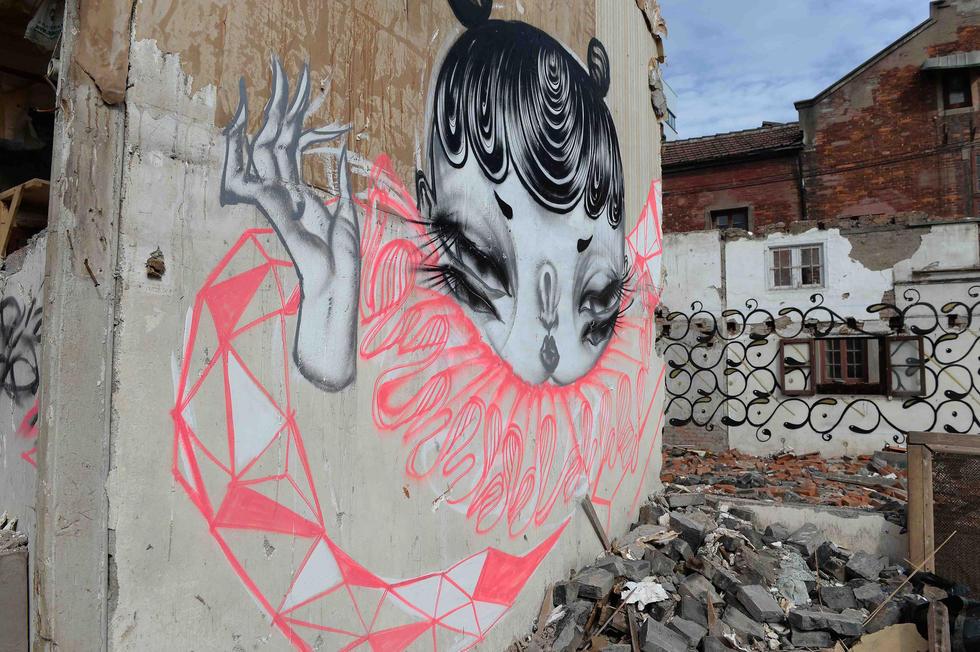 Graffiti paintings on the walls of demolished buildings are painted by French artist Julien Malland and Chinese artist Shi Zheng in December 2014. Shi said that mural on demolished building is short-lived arts and he is ready to say goodbye to their work. (Photo/ newssc.org)