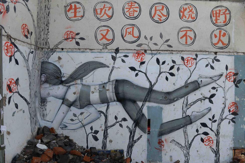Graffiti paintings on the walls of demolished buildings are painted by French artist Julien Malland and Chinese artist Shi Zheng in December 2014. Shi said that mural on demolished building is short-lived arts and he is ready to say goodbye to their work. (Photo/ newssc.org)
