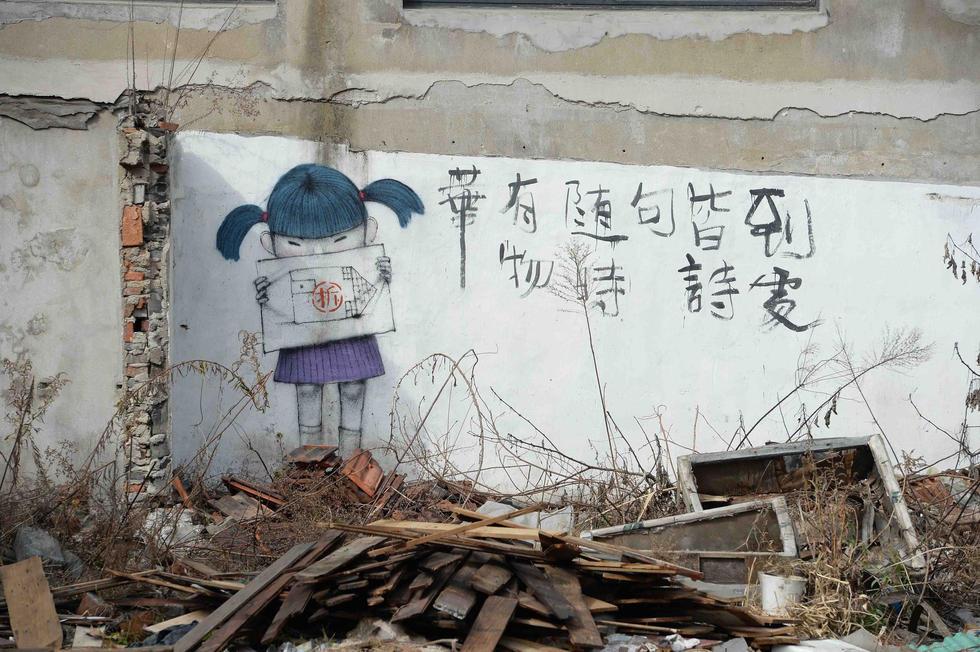 Graffiti paintings on the walls of demolished buildings are painted by French artist Julien Malland and Chinese artist Shi Zheng in December 2014. Shi said that mural on demolished building is short-lived arts and he is ready to say goodbye to their work. (Photo/ newssc.org)