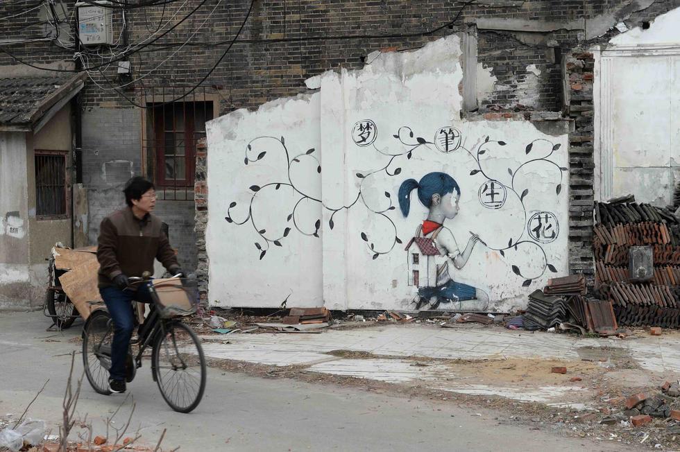 Graffiti paintings on the walls of demolished buildings are painted by French artist Julien Malland and Chinese artist Shi Zheng in December 2014. Shi said that mural on demolished building is short-lived arts and he is ready to say goodbye to their work. (Photo/ newssc.org) |
