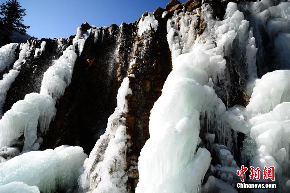 Ice waterfalls appear at Guanhegou National Forestry Park in northwest China's Gansu province on Jan.21, 2015. (CNS/Yang Yanmin)
