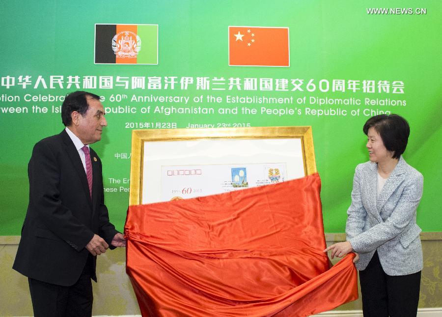 Shen Yueyue (R), vice-chairwoman of the Standing Committee of China's National People's Congress, and Afghan Ambassador to China Mohammad Kabir Farahi unveil a first-day cover commemorating diplomatic ties between China and Afghanistan during a reception in Beijing, capital of China, Jan. 23, 2015. The Chinese People's Association for Friendship with Foreign Countries and the Embassy of Afghanistan in Beijing held a reception on Friday to mark the 60th anniversary of the establishment of diplomatic ties between China and Afghanistan. (Xinhua/Wang Ye)