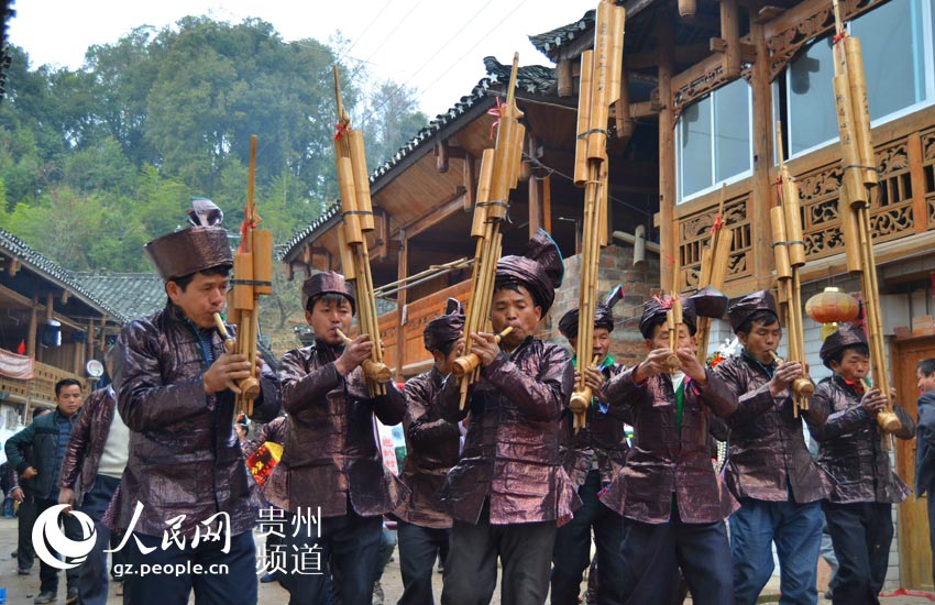 Villagers welcome guests by playing Lusheng, a traditional Chinese instrument, in Congjiang county, southwest China's Guizhou province. (gz.people.cn/He Huiyu)