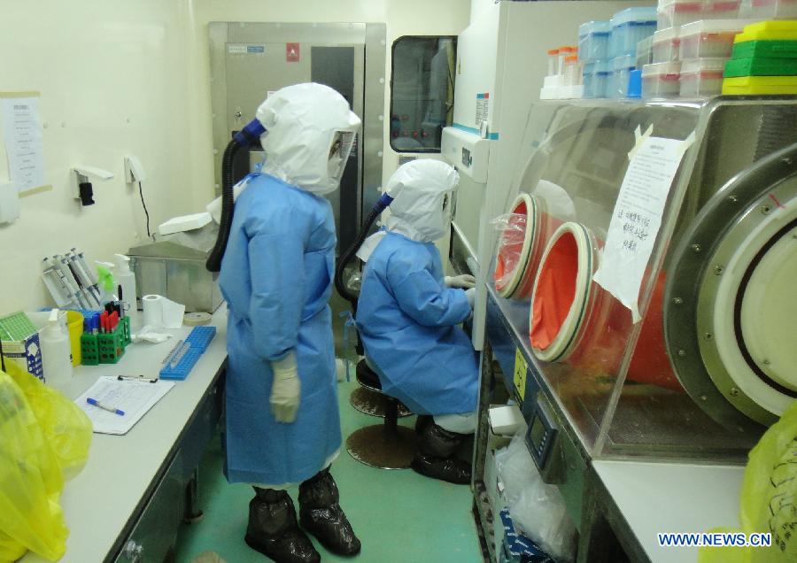 Members of Chinese mobile laboratory team work at a laboratory in Freetown, capital of Sierra Leone, Jan. 22, 2015. The laboratory team have already tested 3,995 Ebola-related blood samples including 1,407 tested positive. (Xinhua/Xin Wenwen) |