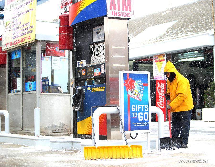A work cleans off snow at a gas station in New York City, the United States, Jan. 26, 2015. The U.S. National Weather Service issued a blizzard warning for New York City and surrounding areas between coastal New Jersey and Connecticut, beginning 1 p.m. EST (1800 GMT) Monday and worsening overnight into Tuesday morning. (Xinhua/Qin Lang) |
