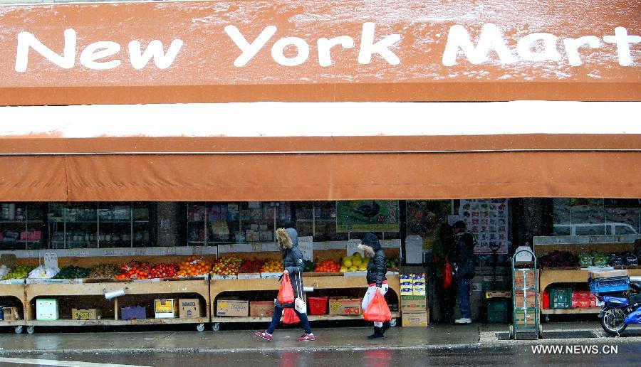 Pedestrians walk in snow in a street in New York City, the United States, Jan. 26, 2015. The U.S. National Weather Service issued a blizzard warning for New York City and surrounding areas between coastal New Jersey and Connecticut, beginning 1 p.m. EST (1800 GMT) Monday and worsening overnight into Tuesday morning. (Xinhua/Qin Lang) |