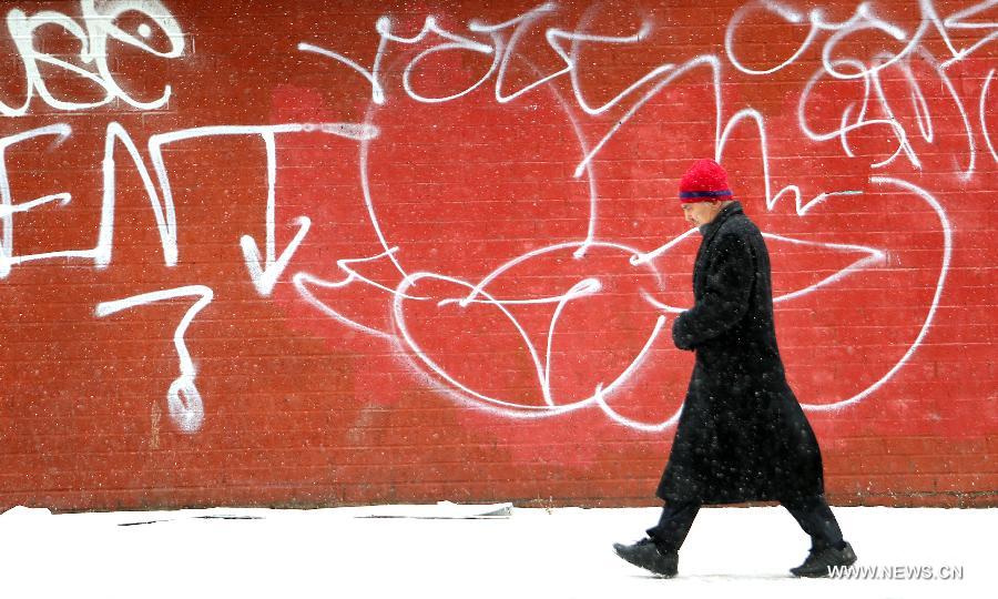 A pedestrian walks in snow in a street in New York City, the United States, Jan. 26, 2015. The U.S. National Weather Service issued a blizzard warning for New York City and surrounding areas between coastal New Jersey and Connecticut, beginning 1 p.m. EST (1800 GMT) Monday and worsening overnight into Tuesday morning. (Xinhua/Qin Lang) |