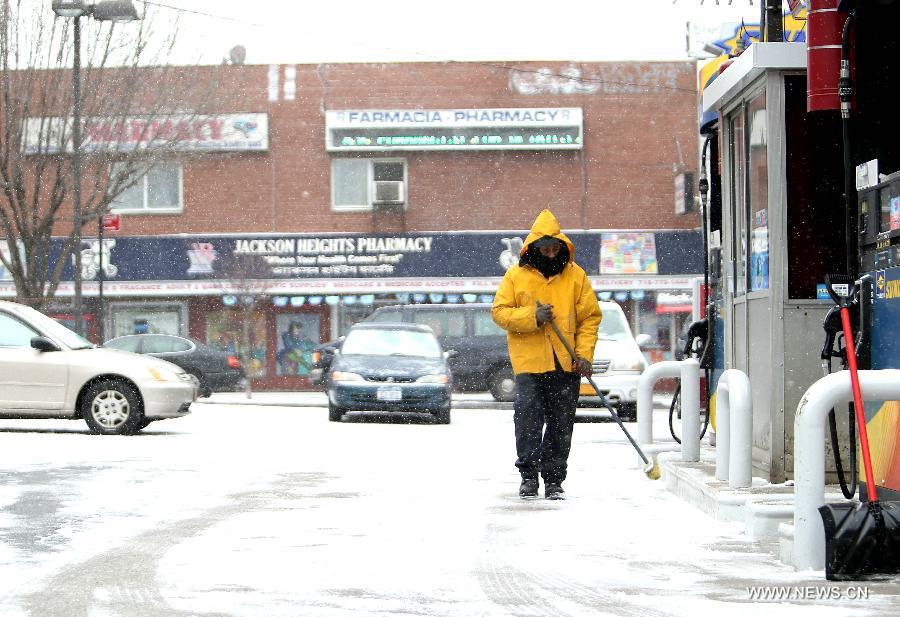 A work cleans off snow at a gas station in New York City, the United States, Jan. 26, 2015. The U.S. National Weather Service issued a blizzard warning for New York City and surrounding areas between coastal New Jersey and Connecticut, beginning 1 p.m. EST (1800 GMT) Monday and worsening overnight into Tuesday morning. (Xinhua/Qin Lang) |
