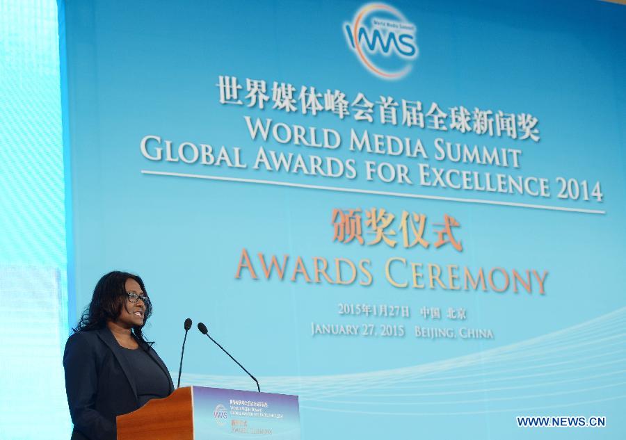 Daisy Veerasingham, senior vice president of the Associated Press, addresses the awarding ceremony of the World Media Summit (WMS) Global Awards for Excellence 2014 in Beijing, capital of China, Jan. 27, 2015. (Xinhua/Chen Yehua)