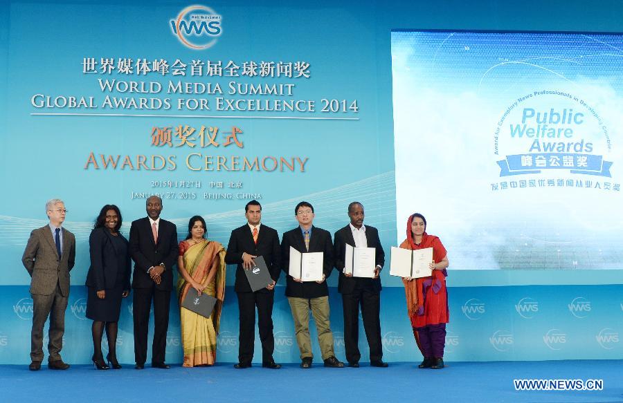 Nominees of the Award for Exemplary News Professionals in Developing Countries pose for photos with presenters during the awarding ceremony of the World Media Summit (WMS) Global Awards for Excellence 2014 in Beijing, capital of China, Jan. 27, 2015. (Xinhua/Chen Yehua) |