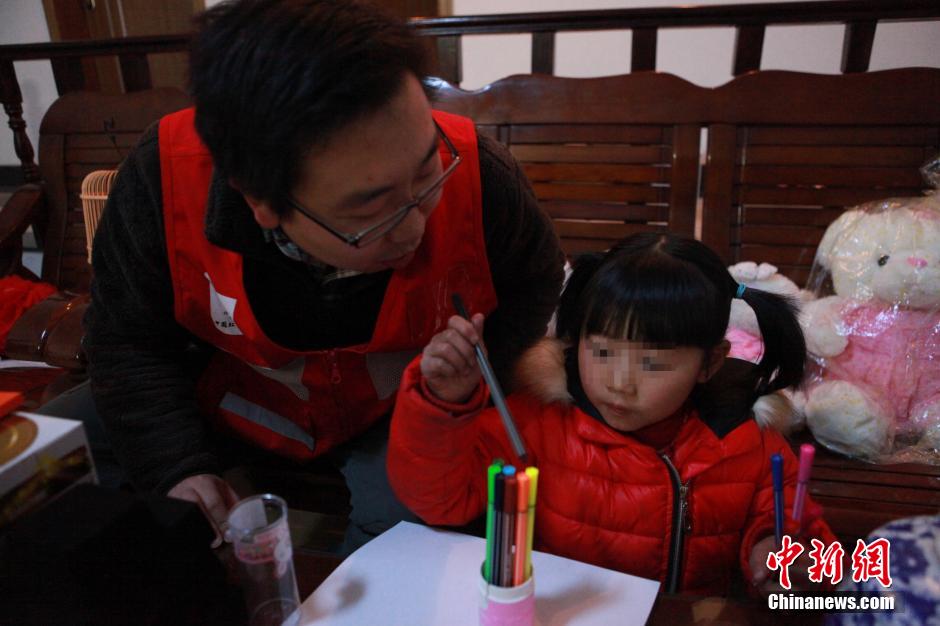 A staff member from Chinese Red Cross Foundation prepares to paint with Xiaoyu. (CNS/Yang Su)