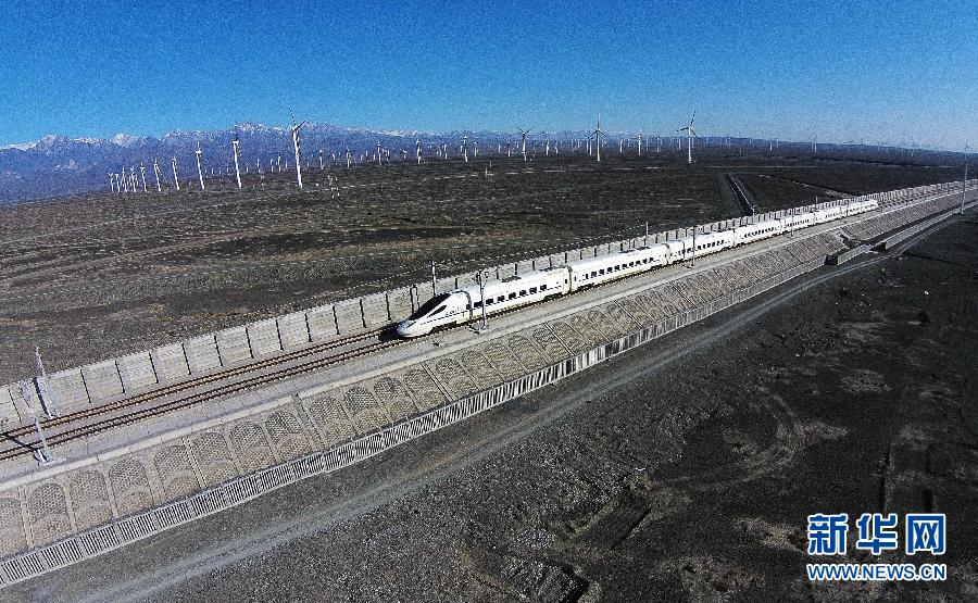 On Nov. 16, 2014, Bullet train D8081 passes through Dabancheng wind power plant. (Photo/Xinhua)