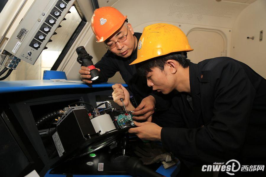 Maintenance workers examine the electronic equipment in the cab. (Photo source: cnwest.com)