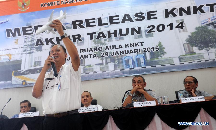 An investigator from the National Transport Safety Committee (KNKT) speaks during the press conference of preliminary accident report of AirAsia QZ8501 in Jakarta, Indonesia, Jan. 29, 2015. The French co-pilot was flying the AirAsia flight before it crashed into Indonesia's waters last month, investigators said here on Thursday. (Xinhua/Agung Kuncahya B.)