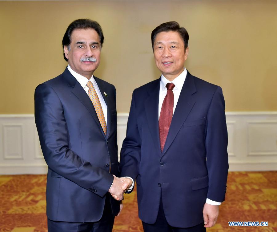 Chinese Vice President Li Yuanchao (R) meets with Sardar Ayaz Sadiq, speaker of Parliament of Pakistan, before the launching ceremony of the China-Pakistan Year of Friendly Exchanges for 2015 in Beijing, capital of China, Jan. 28, 2015. (Xinhua/Li Tao) |
