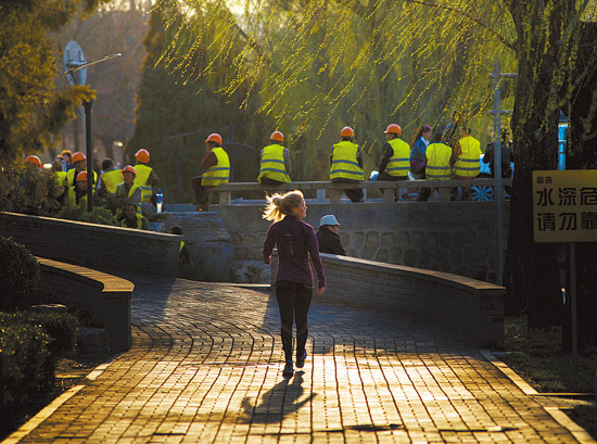 An expat jogs along the Liangma River. Not far from where, a team of construction workers waited for bus to return to their home after work.