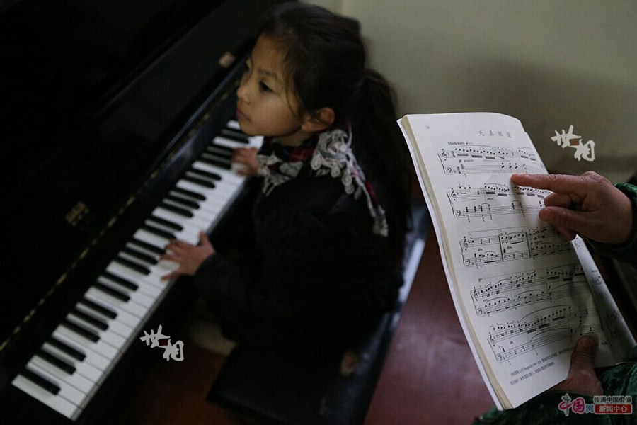 Xiaonan's mother reads the music score for her while Xiaonan practices the piano. (China.org/Pu Cun)