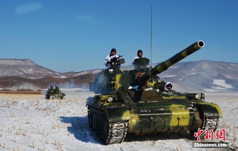In the severe cold of minus 34 degrees Celsius, a brigade of the 16th Group Army conducts field training in northeast China on Jan. 27, 2015, so as to improve the combat ability of soldiers in severe weather. (Chinanews/Yang Zaixin)