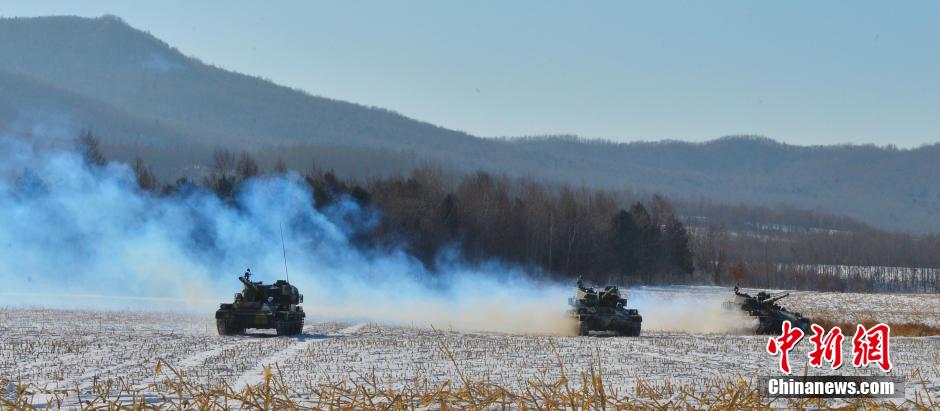 In the severe cold of minus 34 degrees Celsius, a brigade of the 16th Group Army conducts field training in northeast China on Jan. 27, 2015, so as to improve the combat ability of soldiers in severe weather. (Chinanews/Yang Zaixin)
