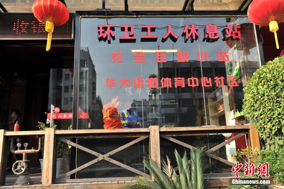 On Jan. 29, a restaurant in Fuzhou set up a rest room for sanitation workers. The room was equipped with two roles of sofas, thermos, water purifiers, a microwave oven. It also provides instant noodles and medicine for the workers. (Chinanews.com/Lv Ming) |