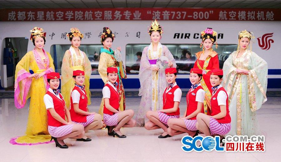 Students in an aviation institute in Chengdu, southwest China's Sichuan province dressed in costumes in Tang Dynasty attend training on Jan. 15, 2015. (Photo/Scol.com.cn)