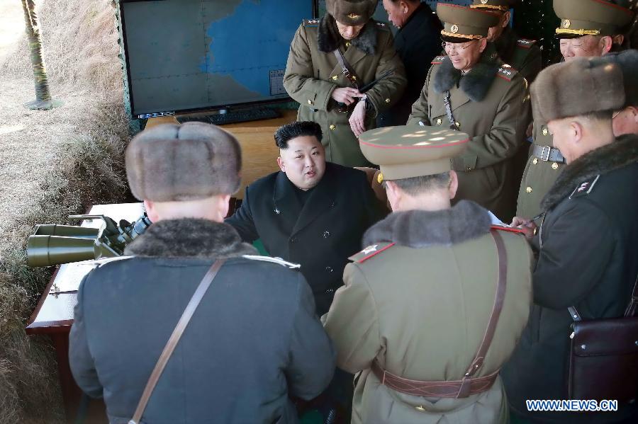 Photo provided by Korean Central News Agency (KCNA) on Jan. 31, 2015 shows top leader of the Democratic People's Republic of Korea (DPRK) Kim Jong Un (C) inspecting a drill of the Korean People's Army (KPA). The fighter airmen and combined submarine units successively carried out the drill. Kim Jong Un gave instructions for bolstering up the operation capabilities of the units of all services. He said that the DPRK is ready to counter any war including a war by conventional armed forces or a nuclear war. (Xinhua/KCNA) |