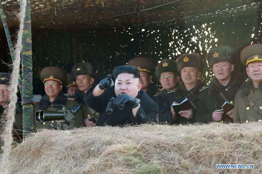 Photo provided by Korean Central News Agency (KCNA) on Jan. 31, 2015 shows top leader of the Democratic People's Republic of Korea (DPRK) Kim Jong Un (front) inspecting a drill of the Korean People's Army (KPA). The fighter airmen and combined submarine units successively carried out the drill. Kim Jong Un gave instructions for bolstering up the operation capabilities of the units of all services. He said that the DPRK is ready to counter any war including a war by conventional armed forces or a nuclear war. (Xinhua/KCNA)