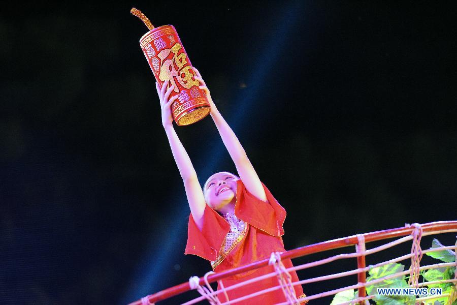 A performer dances at the light up ceremony in Singapore's Chinatown on Jan. 31, 2015. Singapore's Chinatown held a light up ceremony for the Lunar New Year celebrations on Saturday. (Xinhua/Then Chih Wey)