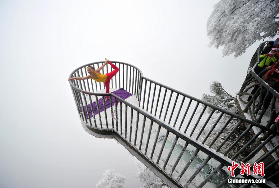Women do yoga in Hunan's Tianmenshan after snowfall (3)