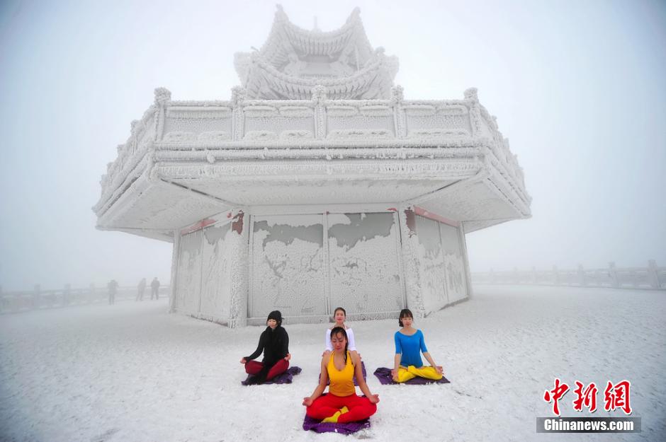 Photo taken on Jan. 31, 2015 shows women doing yoga in Tianmenshan scenic spot after a snowfall in Zhangjiajie City, central China's Hunan Province. (Photo source:chinanews.com)