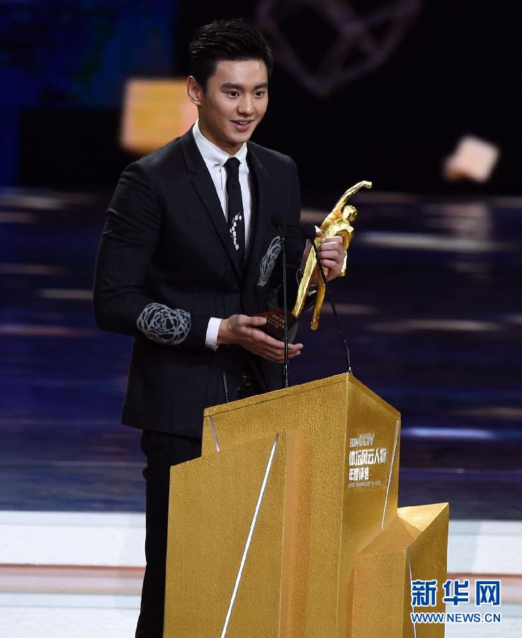 Swimming athlete Ning Zetao poses with trophy at the awarding ceremony of the 2014 Sports Personality of the Year after he was awarded the Best Male Athlete of the year, in Beijing, capital of China, on Feb. 1, 2015. (Source: Xinhuanet.com)
