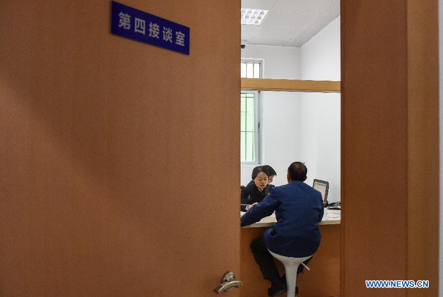 A judge of China's Supreme People's Court first circuit court receives a claimant at the reception room in Shenzhen, south China's Guangdong Province, Feb. 2, 2015. The first circuit court of China's Supreme People's Court (SPC) began to hear cases officially Monday in Shenzhen. (Xinhua/Mao Siqian) |