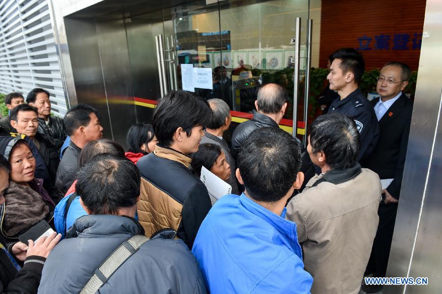 Claimants wait outside China's Supreme People's Court first circuit court in Shenzhen, south China's Guangdong Province, Feb. 2, 2015. The first circuit court of China's Supreme People's Court (SPC) began to hear cases officially Monday in Shenzhen. (Xinhua/Mao Siqian) |