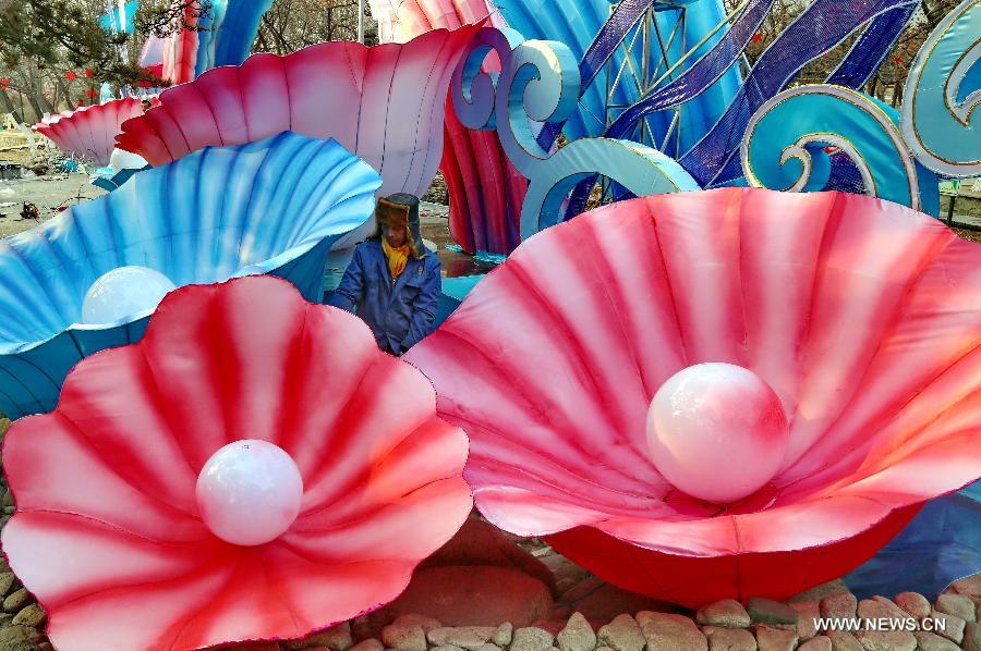 A worker fixes a lantern in a scenic spot in Beidaihe scenic area in Qinhuangdao City, north China's Hebei Province, Feb. 2, 2015. A spring festival lantern expo will be held here for 25 days starting from Feb. 10. (Xinhua/Yang Shiyao)
